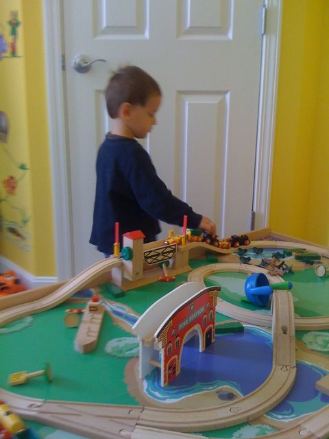 Aiden messed up his train set last night, but Daddy recreated it this morning EVEN BETTER! Lots of fun now!